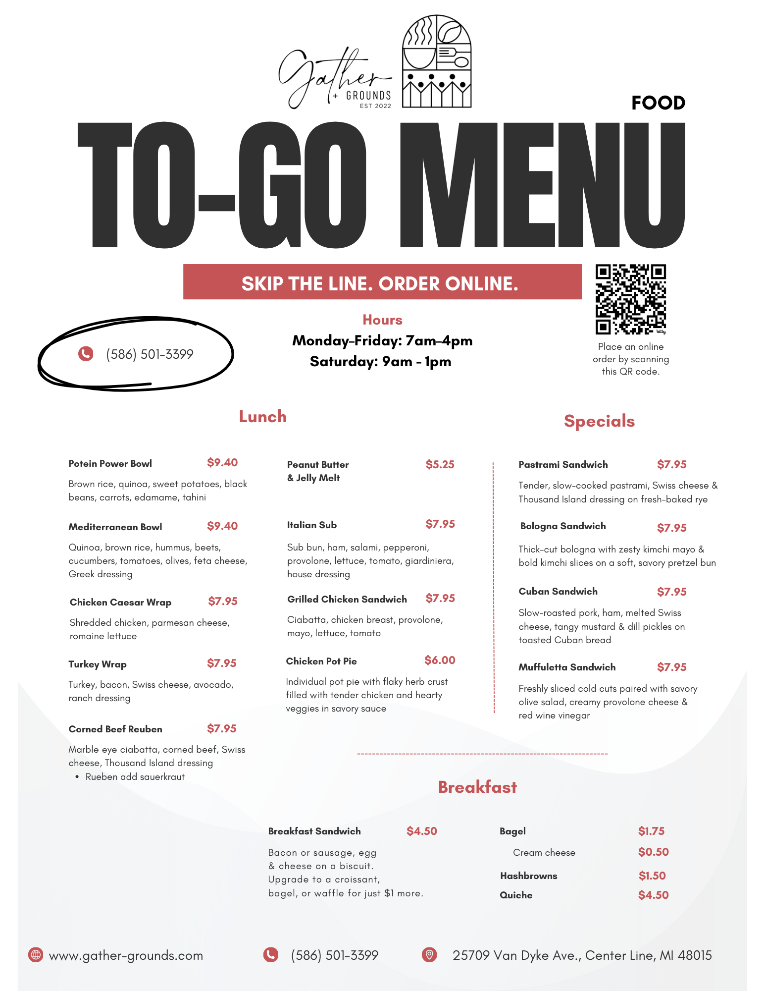 Gather + Grounds just got even better! From bold new flavors to cozy classics, our revamped menu is here to delight your taste buds.